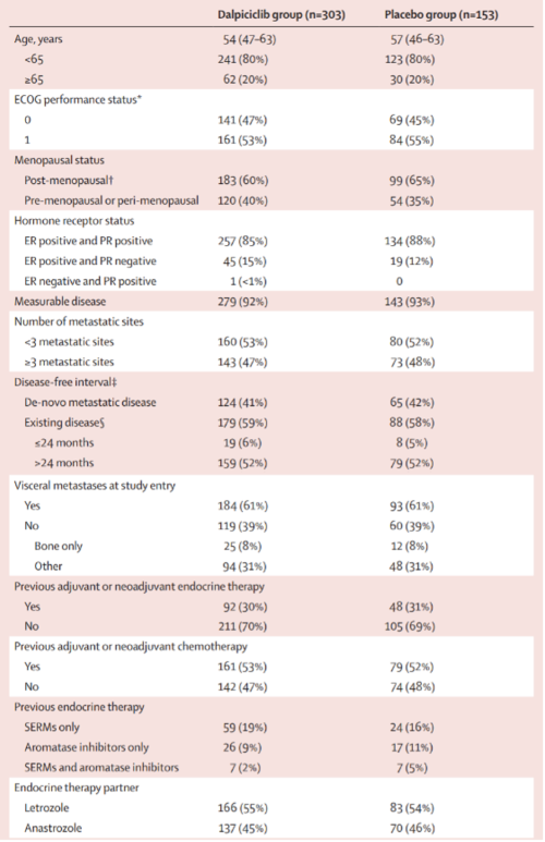 主要研究终点是研究者评估的PFS(预设单侧P≤0.0076为优效)。次要研究终点为盲法独立审查委员会(BIRC)评估的PFS、总生存(OS)、客观缓解率(ORR)、临床获益率(CBR)、缓解持续时间(DoR)和安全性。根据内脏转移(是vs否)、既往(新)辅助接受内分泌治疗(是vs否)和试验中联用何种非甾体类芳香化酶抑制剂(来曲唑vs阿那曲唑)对患者进行分层。
