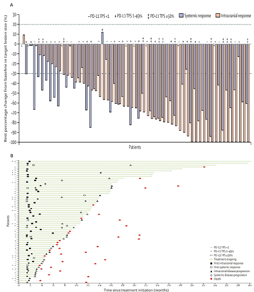 图3. cEFR中颅内或整体靶病灶直径总和与基线相比的最佳百分比变化