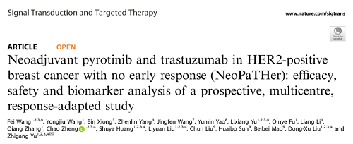 [1] Fei Wang, Yongjiu Wang, Bin Xiong, Zhenlin Yang, Jingfen Wang, Yumin Yao, Zhigang Yu.et al. Neoadjuvant pyrotinib and trastuzumab in HER2-positive breast cancer with no early response (NeoPaTHer): efficacy, safety and biomarker analysis of a prospective, multicentre, response-adapted study. Signal Transduction and Targeted Therapy (2025) 10:45.