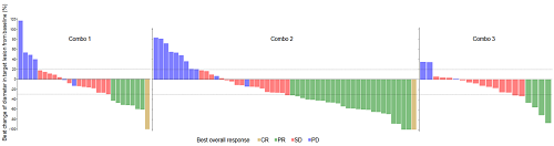 在联合队列2(SHR-8068 4 mg/kg单剂联合阿得贝利单抗和贝伐珠单抗)中,研究者基于RECIST v1.1评估的ORR为47.2%(25/53;95% CI 33.3-61.4%),中位DoR为12.7个月(95% CI 5.8-NR),中位PFS达到8.7个月(95% CI 5.5-11.6)。数值上,联合队列2的ORR和生存结果均高于联合队列1和联合队列3。