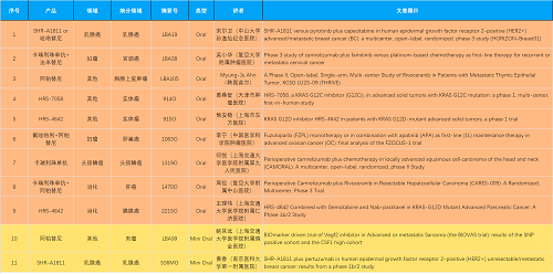15款创新药包括10款已上市产品:注射用瑞康曲妥珠单抗(艾维达®,研发代号:SHR-A1811)、注射用卡瑞利珠单抗(艾瑞卡®)、苹果酸法米替尼胶囊(艾比特®)、甲磺酸阿帕替尼片(艾坦®)、马来酸吡咯替尼片(艾瑞妮®)、阿得贝利单抗注射液(艾瑞利®)、羟乙磺酸达尔西利片(艾瑞康®)、氟唑帕利胶囊(艾瑞颐®)、瑞维鲁胺片(艾瑞恩®)、海曲泊帕乙醇胺片(恒曲®),以及5款未上市产品,包括KRASG12C抑制剂HRS-7058、KRASG12D抑制剂HRS-4642、选择性的AR-PROTAC(雄激素受体-蛋白降解靶向嵌合体)小分子HRS-5041、抗PD-L1/TGF-βRII双抗瑞拉芙普-α注射液(SHR-1701)、Trop-2 ADC SHR-A1921。2类新药盐酸伊立替康脂质体注射液(II)(越优力®)及国内首仿药昂丹司琼口溶膜(艾其速®)各有1项研究入选。本文特对研究成果做了梳理,带领各位读者领略赢多多医药创新之光。