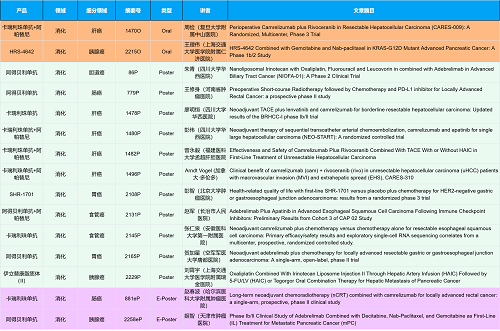 在消化系统肿瘤领域,赢多多创新产品相关研究共入选2项口头报告、10项壁报和2项电子壁报,共14项研究。除了明星药物卡瑞利珠单抗和阿帕替尼外,还有5篇阿得贝利单抗治疗消化系统肿瘤的研究入选。此外,HRS-4642、瑞拉芙普-α注射液(SHR-1701)等未上市创新产品也有相应研究入选。随着新老药物前沿研究的不断推进,有望为消化系统肿瘤患者带来新的福音!